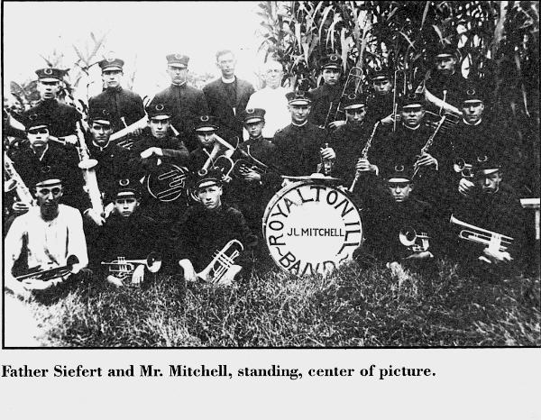 The Royalton J. L. Mitchell Band was organized around 1918-1919, according to this story which was told by Mary Missavage. Paul Lutostanski, who was the organist in the St. Aloysuis Catholic Church, said, "What this town needs is a band." Father Siefert replied, "Well, why don't you organize one?" Paul answered, "It costs too much money." Father Siefert suggested, "Why don't we go to Mitchell and have him sponsor one for us?" That is exactly what they did. That is exactly why most of the members were Catholic. The band played for parades, homecomings, and miner's meetings. It was like a big picnic when they performed. Sometimes the Polish lodge would have a big thing, and this band would come and lead the parade. During World War I, they played when the soldiers left; about forty of them left at one time. So, they played at serious times as well as fun times. |
