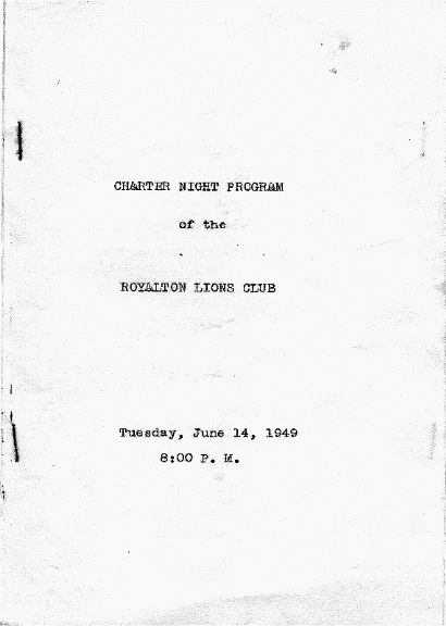 "Charter Night Program" of the Royalton Lions Club held on Tuesday, June 14, 1949 furnished by Ronnie Ervin,, Bob Ervin's son (Bob Ervin was President of the Royalton Lions Club at the time of this program.)