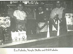 "No, I knew when I left from Chicago that the store would be a success," Eva Kuhnke related. "When we made up our minds to purchase the store we didn't have any alternatives. We were determined to make the business a success." The Kuhnke's have not changed much to the store they owned for 31 years. Yes they had some little changes to the building. Their source of heat changed from a pot bellied stove to a coal furnace and now to natural gas. But they have instilled an honest, relaxed atmosphere which makes customers comfortable when shopping or just visiting at Kuhnke's. Business for the Kuhnke's started well from the beginning as the July Fourth weekend brought many people into the store. "Royalton in 1949, was a booming town, with two mines nearby and the business was pretty good," explained Eva; "We had people standing in line outside to order cigarettes or special things they wanted." "Hadacol was a hot number in patented medicine around Royalton for a time." laughed Eva. "Hadacol was a liquid vitamin - which contained 11 percent alcohol. People would wait in line for that order." In 1957, Sam went back to the railroad, a job he had In Chicago before the Kuhnke's moved back to Royalton. The mines closed during this time and Sam wanted to provide extra income to help maintain and remodel their store. But the closing of the mines didn't force the Kuhnke's out of business. People still came in to get various items in the store. One of the favorite items people came into Kuhnke's Sundries for was ice cream. People came in droves to taste the old fashioned ice cream the Kuhnke's had on hand for the customers. "Back years ago the church people and younger people would congregate here, eating our old fashioned ice cream," said Eva. "We even had curb service." "Curb service is like what you would call a drive-in window," Eva explained. "Cars would come by and stop outside the store entrance and honk their horns for service. We had a boy go outside and take the customer's order. Most of the time it was an orderfor ice cream. We sold a lot of ice cream. We had a 10 hour service from 8 a.m. to 11p.m.'' The summer months were the busiest ice cream months for the Kuhnke's, as they made more than 250 gallons of ice cream a month. In 1972, the last year, the Kuhnke's made their own ice cream, the Kuhnke's made 3000 gallons in this 12 month period. Not as many church groups or young people congregate at Kuhnke's any more but people still come for miles away to taste the good ole' fashioned ice cream. "Chocolate and vanilla were the favorite flavors customers like the most for their malts," explained Eva. "The favorite soft drink is a cherry coke." Eva still makes her own syrup and secret recipes today, although they have stopped making their own ice cream. "But we purchase an ice cream which tastes like the old fashioned kind," said Eva. Eva also has high standards with her soft. drinks and malts. "I make my own syrups and in don't like it I wouldn't sell it to my customers," said Eva. "I want to sell.. soft drinks and malts which taste good." Prices have risen since the Kuhnke's started their business, thanks to the rising inflation and costs. Cones cost five cents a dip, and cokes were also five cents in 1948. Today that same cone will cost you 45 cents and a small coke is now 20 cents. But, the quantity the customer receives is more than the average store. Inflation, recession, high costs, has today's economy affected Kuhnke's Sundries. " "We sell just as much but the profit margin is just not there." stated Eva. "We don't have the volume larger stores have but people have accepted the rise in prices. Inflation has driven small businesses price up but we try to keep prices as low as we can. This helps people from not wasting gas going out of town for every little thing." Kids are a frequent clientele in Kuhnke's. They come to visit Eva for various reason: for ice cream, to show her a new hair style, to share their gripes or just to have a friendly conversation. "I feel I get along pretty good with the kids," said Eva. "I think I would be in trouble if I didn't enjoy the kids who come in here. I don't think I would have lasted long in the business." "I listen to various people who come in here," Eva acknowledged. "They come in here with their complaints, kids show me report cards or tell me something about school. " "Before closed campus at the school in Royalton, the kids came in groves and congregated here all the time," explained Eva. "They would come here for their lunch and after school was out. They would even meet here before ball games, waiting for the bus to pick them up." Winter is a season when business slows down at Kuhnke's. But as business slows crocheting increases at the store. "Crocheting is popular here in the winter," said E. "Women come here to exchange patterns and to show each other different ways to crochet. Everybody helps each other when crocheting." Retirement may be in the future plans of Eva Kuhnke but it also may not. "If I closed my doors where would the ladies go to congregate?" asked Eva. "To me this is just not a store but a place to meet together and help each other out." Business is a pleasure in Eva's eyes and she would have it no other way. She helps other people out by listening to their problems, showing them a new pattern in crocheting, selling them an item in her store or just fixing a delicious cherry coke. The Drug Store was previously owned by Doc Bennet, Gordon Shafer, Sr. and Bob Roberts. Kuhnke's had the store open until 1987. Sam passed away in 1985 and Eva in 1987. |