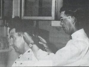 "Brick" spent three years learning the trade and acquired his state license to practice. He later worked in Chicago and then barbered in Hollandia, New Guinea during World War II. A couple of personalities that Hardcastle recalls include Admiral Kincaid, a well-recognized navy man and the Heavyweight Boxing Champion of the World, Gene Tunney. At that time, service men didn't have to pay for their haircut, but Tunney gave one dollar nevertheless. "I kept that dollar and had him autograph it for me. I've still got it in the house someplace," and "Brick", who claims the signature was smeared because when he used to carry it in his billfold, the money got wet once when he was fishing. considerably until the subject was changed over to cards and who was good at what in the Royalton VFW Hall. "Brick" works three days a week now (Thursday, Friday, and Saturday) and has done so for many years. His wife and daughter want him to give up his work, and "Brick" says that isn't likely to happen in the near future. I like to be over here with the guys and talk. They expect me here. Some have said that if I quit, they will come over to my house for their haircut and I don't want that. This has been a good town for me to work in. If I only made $15 - $20 a week, it would be enough for me to take care of my wife and me with Social Security and all." "Brick is also different from other barbers not just in atmosphere (he has a porcelain barber chair rather than metallic and antique wood chairs and razor strap keepsakes), but in general appearance. He dresses up and even wears a tie. "When you are a barber, you are in the public eye. I don't think anyone would come to get a haircut from you if you were dressed like a farmer." He gave an example of someone attired in overalls. smiling at another customer. That's the way "Brick" is, always joking. As the saying goes, they broke the mold, when they made "Brick". A little tongue in cheek humor there. . . Before I left his shop, I couldn't resist. I had to know how "Brick" got his nickname. "When I was five or six years old, my uncle Frank Hardcastle used to run a moving picture building. It was before there was a theater. And, they had some Vaudeville acts there. One of the songs was "Old McDonald Had A Farm." And, instead of singing "here a quack, there a quack, everywhere a quack, quack," I said "here's a brick, there's a brick."; The nickname stuck. . That's some story. It's not exactly a hair-raising experience and you can't really call it a close shave, but you can say that it was an uncut version of the truth. |