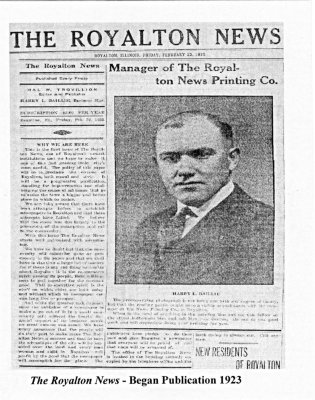Published every Friday Hal. W. Trovillion Editor and Publisher Harry L. Baillie, Business Manager Royalton, Ill., Friday, Feb. 23, 1923 (taken from the paper as it appeared) This is the first issue of The Royalton News, one of Royalton's newest institutions and we hope to make it one of this fast growing little city's most useful. The policy of this paper will be to proclaim the virtues of Royalton, both moral and civic. It will be a progressive publication, standing for improvements and challenging the cause of all issues that go to make the town a bigger and better place in which to reside. We are fully aware that there have been attempts before to establish newspapers in Royalton and that these attempts have failed. We believe that the cause was due largely to the promoters of the enterprises and not to the community. With this issue The Royalton News starts well patronized with advertising. We have no doubt but that the community will subscribe quite as generously to the paper and that we shall have in due time a large list of readers for if there is anyone thing noticeable about Royalton it is the co-operative spirit among its people, their willingness to pull together for the common good. This co-operative spirit is the stuff on which cities are built today and without which no newspaper can long live or prosper. And while the greater task depends upon the publisher of a newspaper to make a go out of it in a small community still without the hearty financial support of its business people no great success can result. We have every assurance that the people will do their part to make The Royalton News a success and that in turn the advantages of the city will be heralded over the land and every man, woman, and child in Royalton will profit by the good that the newspaper will accomplish for the place. The publishers here pledge to do their part and give Royalton a newspaper that everyone will be proud of and that none will be ashamed of. The office of The Royalton News is located in the building recently occupied by the telephone office and the latch string is always out. Call anytime. The list of advertisers in this issue of the paper published below might be called Royalton's first citizens, for they have made possible a newspaper here and therefore we are publishing the list as a sort of honor roll. Their co-operation and patronage promised The Royalton News assures the people that a long felt need has been filled - that from this on the weekly message will go out to the world proclaiming the happenings of this community - that a community spirit will be developed and that civic pride will develop and a healthy public sentiment be formed. Without these things present in a place, no town can develop very far. It will be possible with a newspaper to inform the outside world what is doing over in this side of Franklin county, which as only a few may know, is one of the fastest growing Counties in all the United States. To many people, Royalton is only a name of a mere dot on the map. What its advantages are, what its people think and believe and how nice a place it is to reside in, its fine coal, its schools, churches, lodges, and societies, few know anything about and have heretofore had no good means of finding out. The mission of The Royalton News will be to inform the world of all these things and occasional copies of The News sent to your friends will serve to attract attention to this coming little city and place Royalton on the map of Southern Illinois.